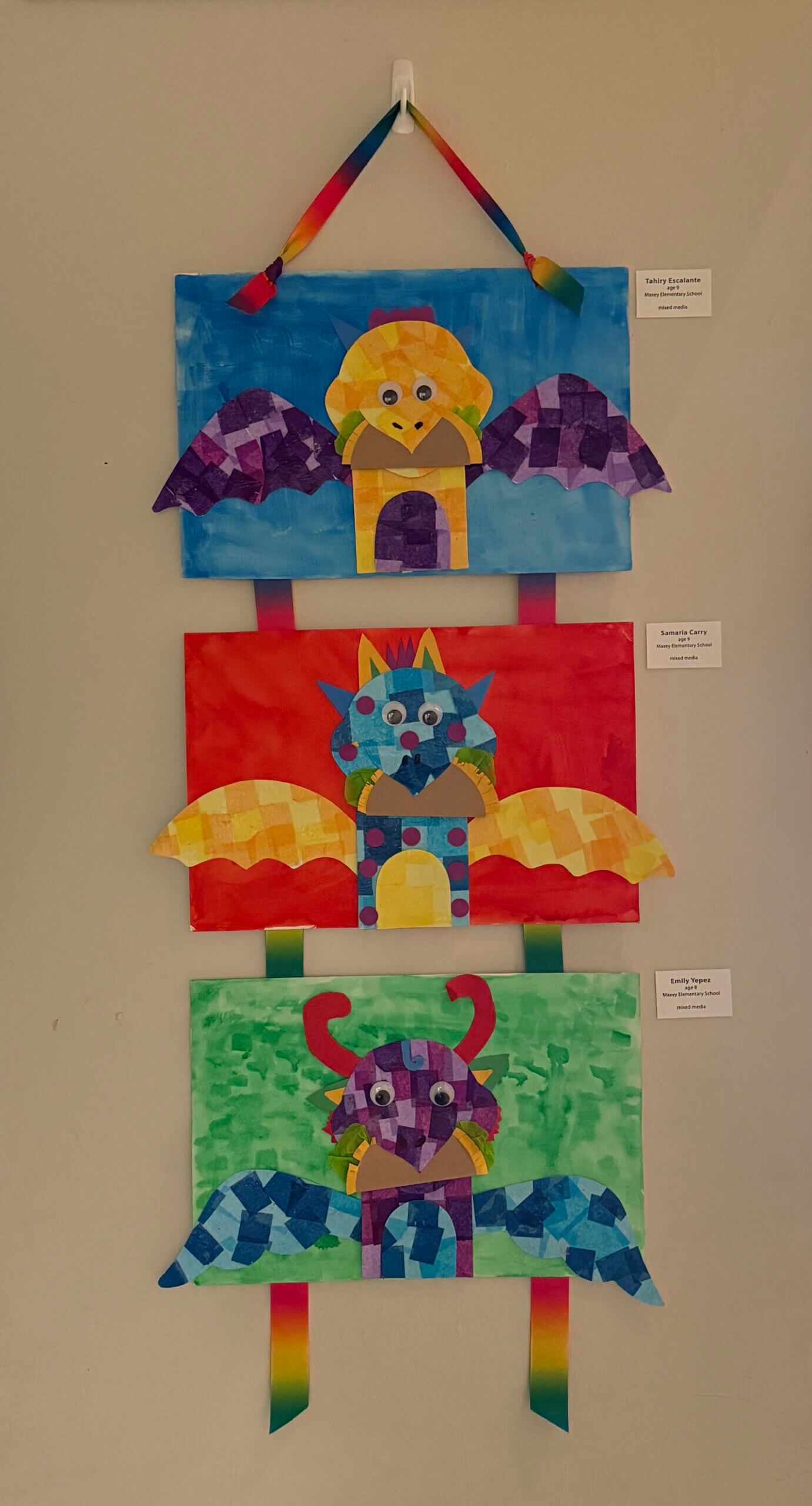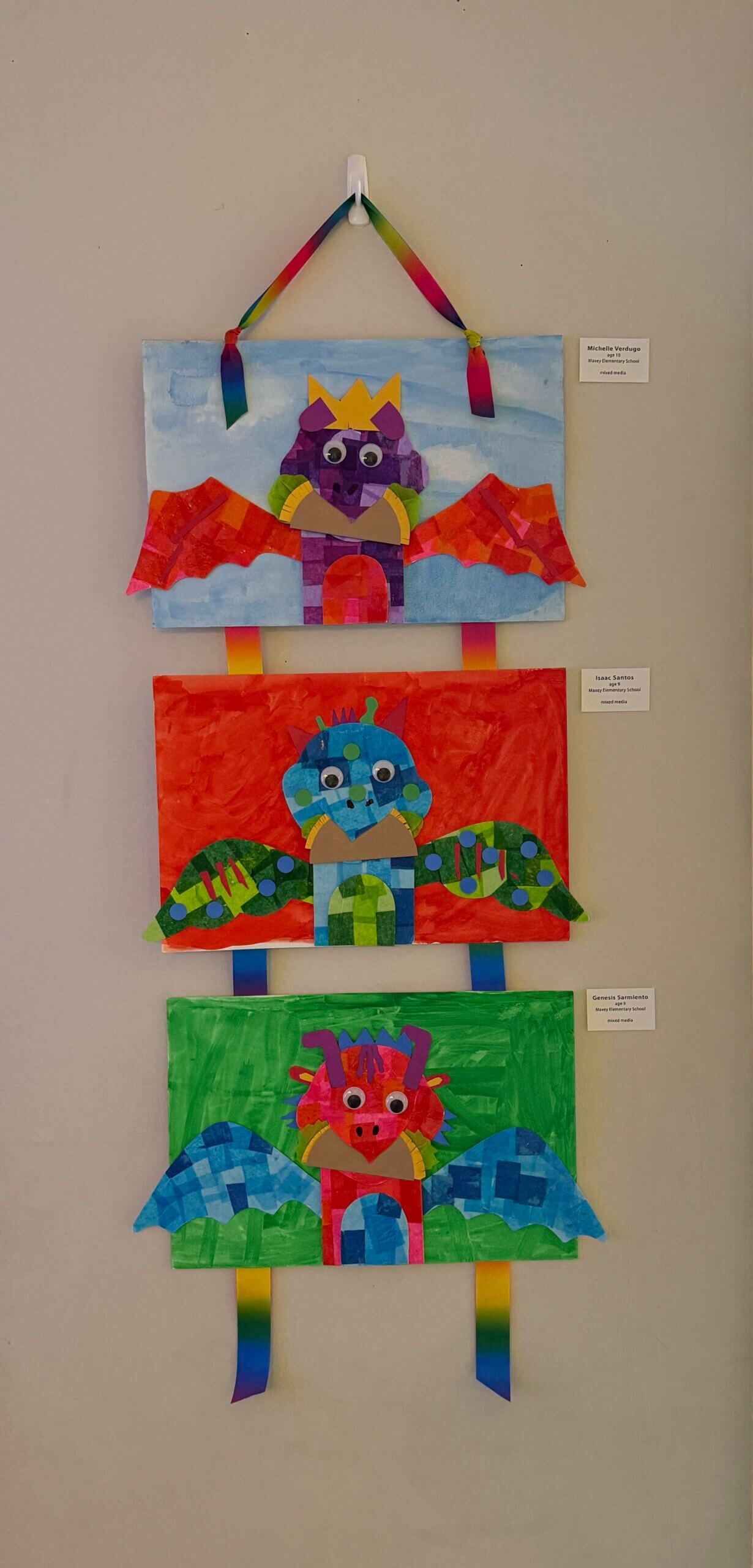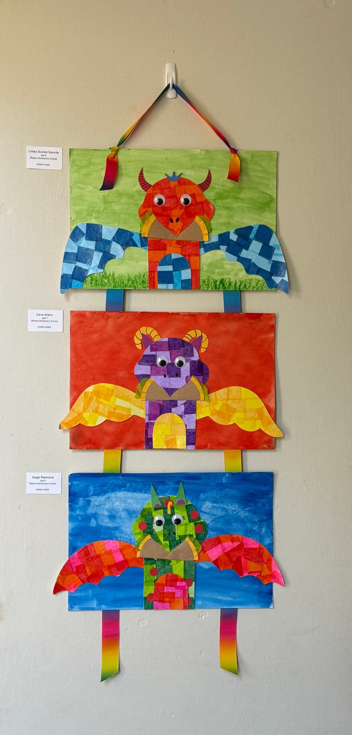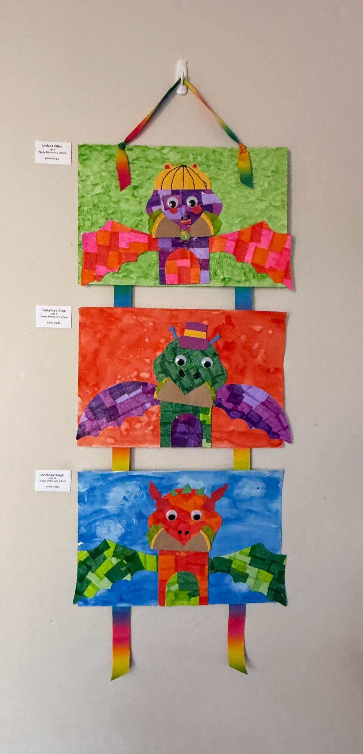 Each student chose colors for their dragon picked its wing shape, and designed its other body parts and accessories. The dragon’s skin was created with decoupaged tissue paper. Body parts and accessories were cut from construction paper. Once assembled, the dragon was placed on a watercolor background painted by the student.