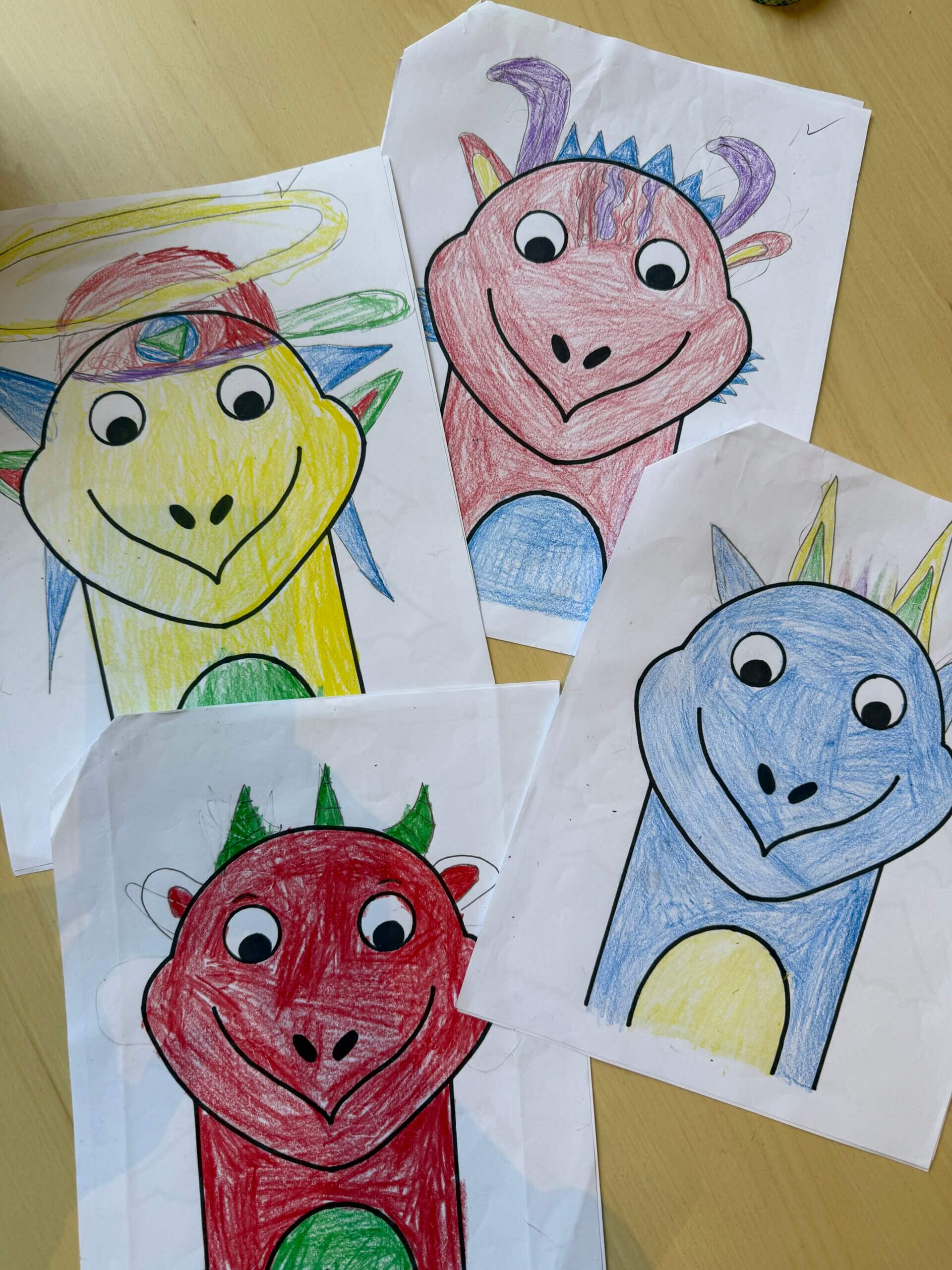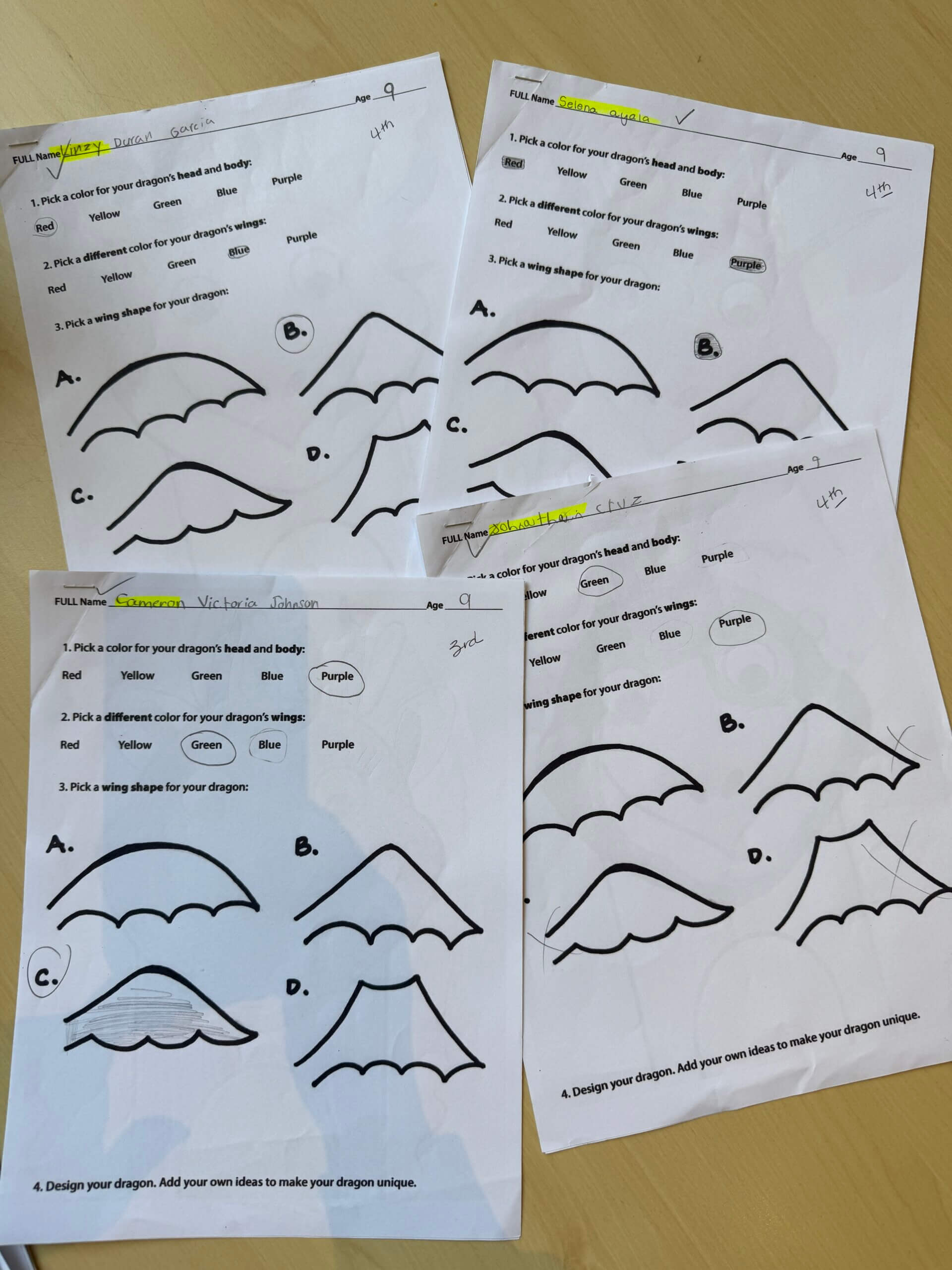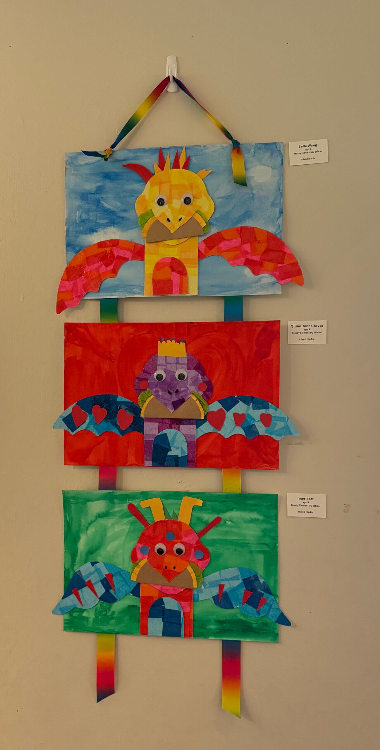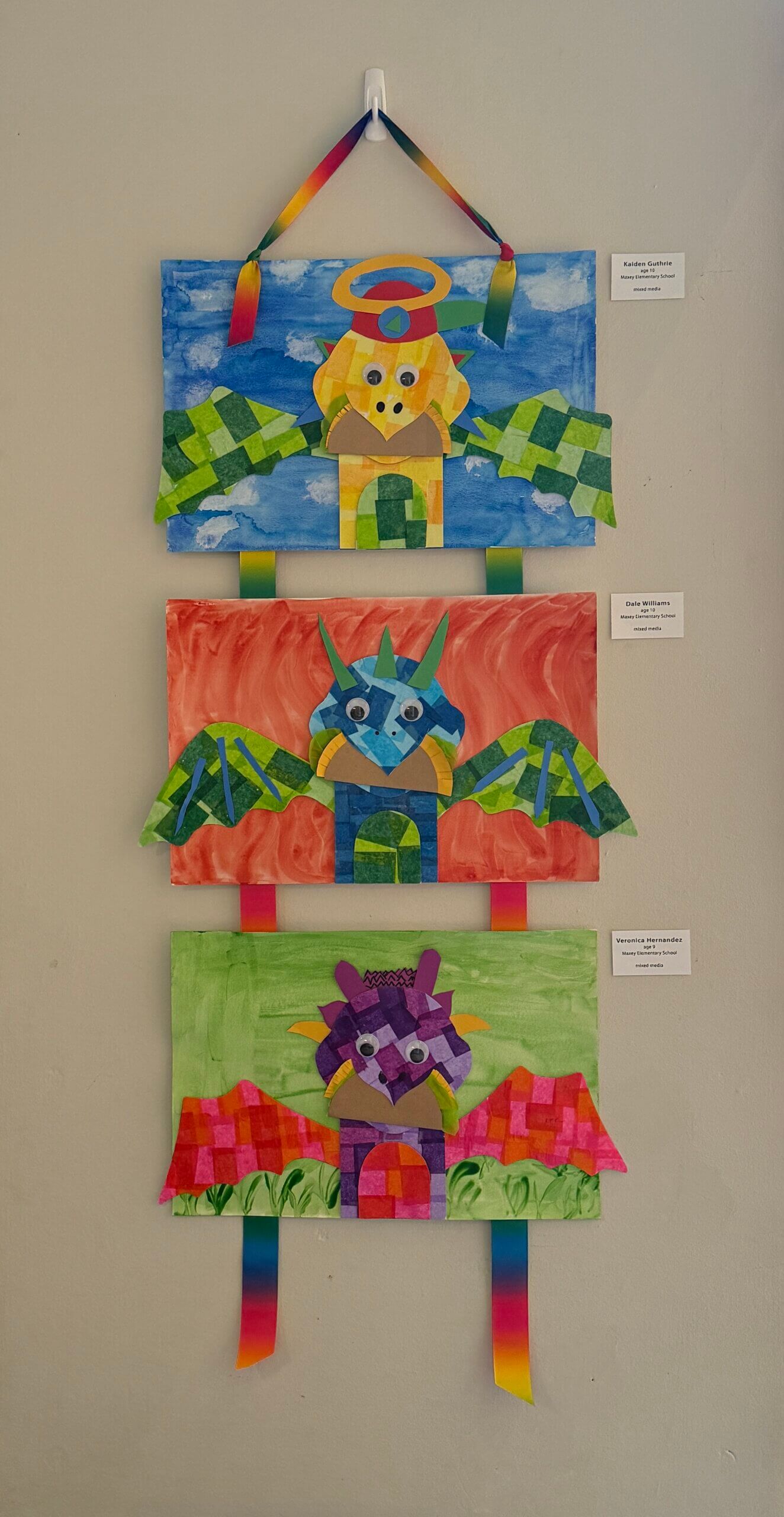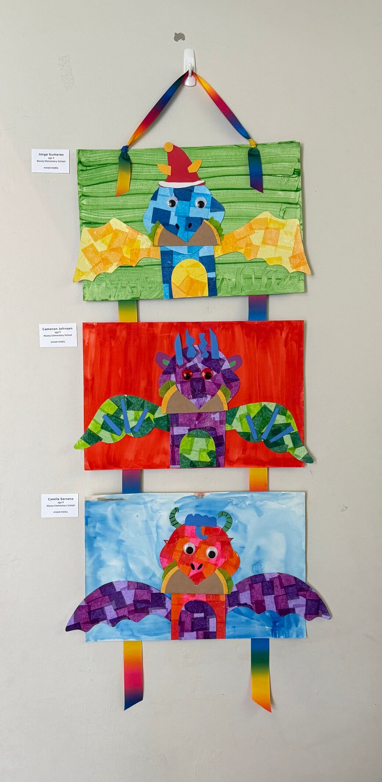Each student chose colors for their dragon picked its wing shape, and designed its other body parts and accessories. The dragon’s skin was created with decoupaged tissue paper. Body parts and accessories were cut from construction paper. Once assembled, the dragon was placed on a watercolor background painted by the student.